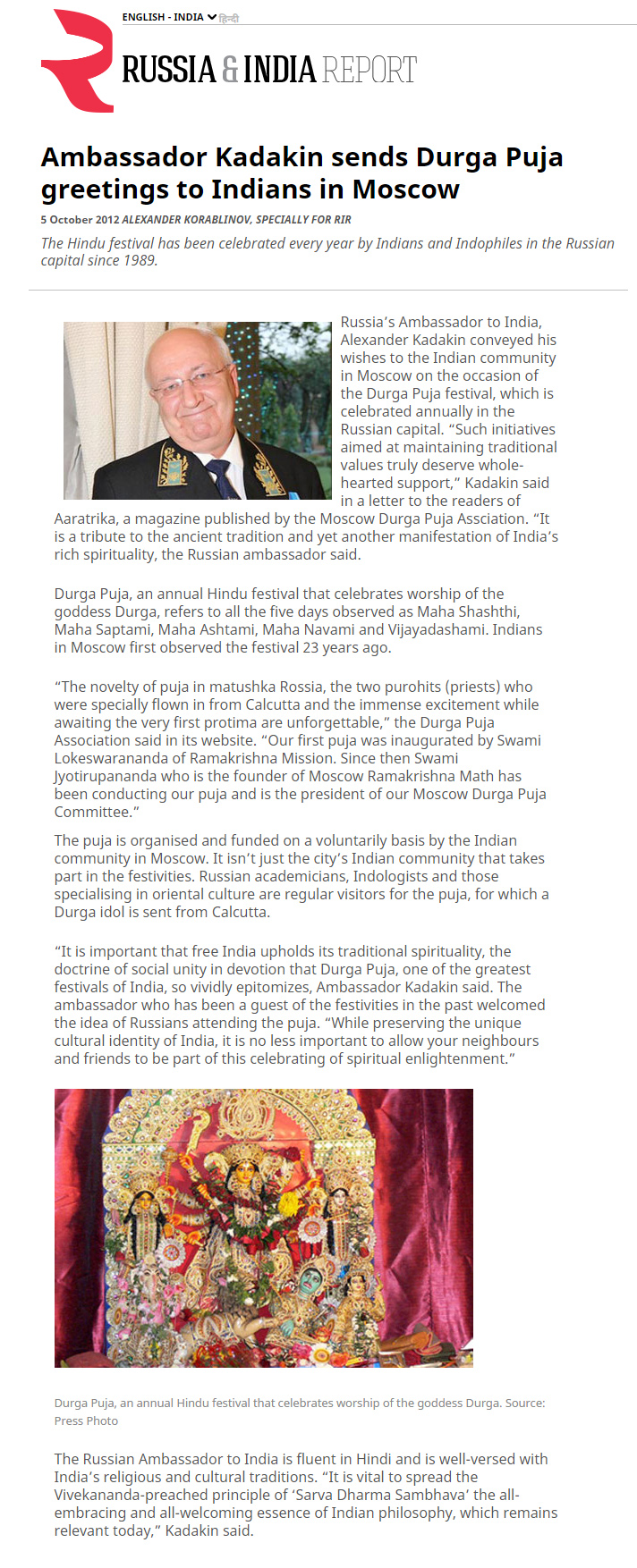 Ambassador Kadakin sends Durga Puja greetings to Indians in Moscow
